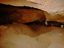 The cave is of an impressive character, almost lacking any speleothems, the main hall is really wide, but only about 1.50 m high and tilted about 45°. This means the path, while crossing the huge chamber, always goes up and down stairs on the roof-like floor. And the path is always cut into the soft dark brown clay on the floor, to be high enough to stand comfortably. The surrounding limestone is 400-million-year-old Middle Devonian limestone. The crinoidal limestone is very rich in fossils, for example trilobites. There are a few speleothems in one section close to the entrance. Later there are two section with unique bulbous calcite. They resemble opal, nevertheless these are calcite speleothems, not quartz.
