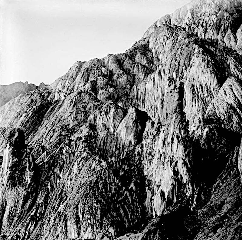 Salt is a sedimentary rock formed by evaporation and easily dissolved by water, actually there is no need for other substances, water is able to dissolve salt easily until it contains 33 % salt, which is a lot. As a result salt deposits reaching the surface are immediately dissolved by meteoric water, in humid climates even before it reaches the surface, because it is dissolved by the groundwater. As a result there are actually only two places in Europe where you can find salt at the surface and one is here at Cardona. A huge diapir formed by salt which was slowly moving upwards to the surface. This is quite typical as salt starts to flow slowly under pressure and temperature. And salt is lighter, it has a lower specific gravity than the surrounding rock, and thus rises like an air bubble in water along faults in the rock. Just very slowly. The diapir here reached the surface and as a result it was eroded by the dissolution of the salt by meteoric water.