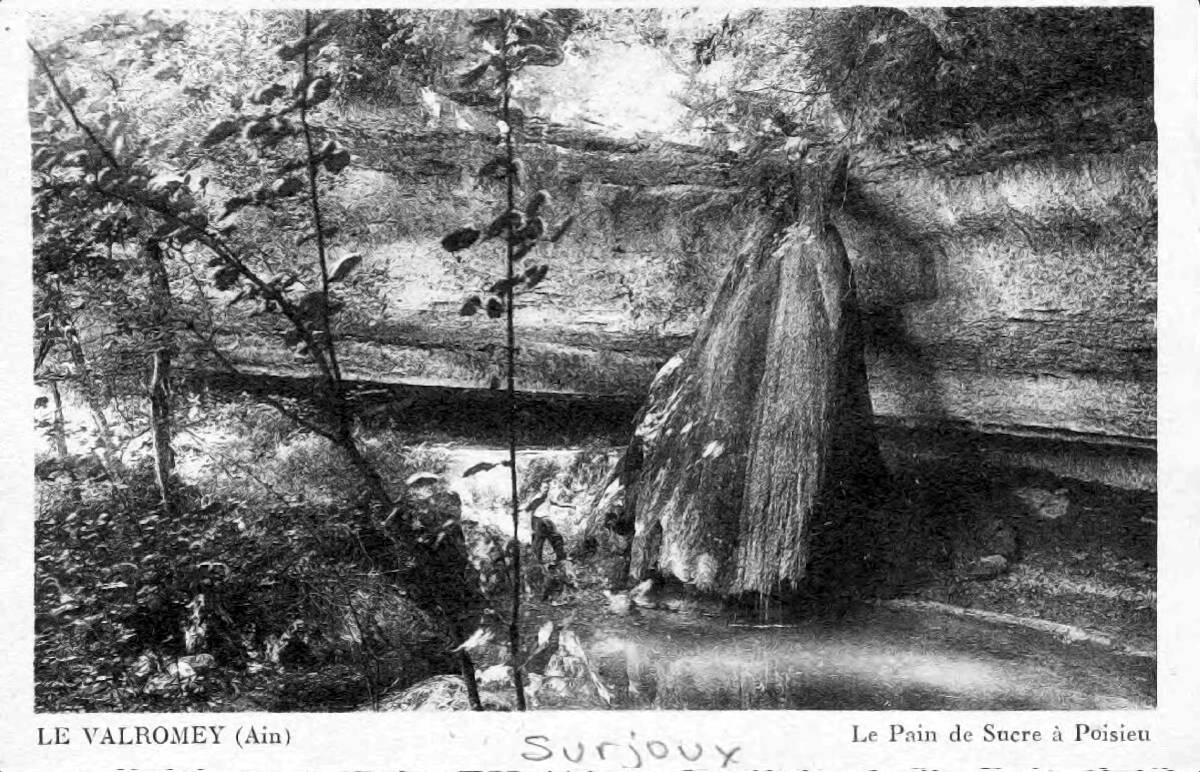 The Cascade du Pain de Sucre (Waterfall of the Sugarloaf) is a small waterfall of limestone rich water not far from the hamlet Poisieu, which belongs to Champagne-en-Valromey, formed by the river La Bèze. It is named after a strange rock formation where the water hits the ground, a subaerial 6 m high stalagmite formed of travertine. Its form resembles obviously a sugar loaf, hence the name.