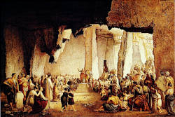 The Orecchio di Dionigi (Ear of Dionysius) is a 65 m long tunnel which is between 5 m and 11 m wide and 23 m high. It is shaped like a gothic arch, with a pointy apex. The strange shape gives the place strange acoustics, the sound is reflected up to 16 times. Michelangelo di Caravaggio visited Siracusa in 1608. He visited this cave in the company of the Siracusan historian Vincenzo Mirabella. Caravaggio named this cave Orecchio di Dionigi because of a legend about the tyrant Dionysius the elder, who is said to have constructed this cave as a prison. The strange acoustics allowed the tyrant to spy his captives by sitting at a place high above where even the calmest whisper was amplified to be understandable. But despite this nice story, the form of the cave is just a result of the mining technique used by the quarry workers. They started at the top and removed layer after layer at the floor of the cave,slightly widening it with every layer. The acoustics is just a coincidence.