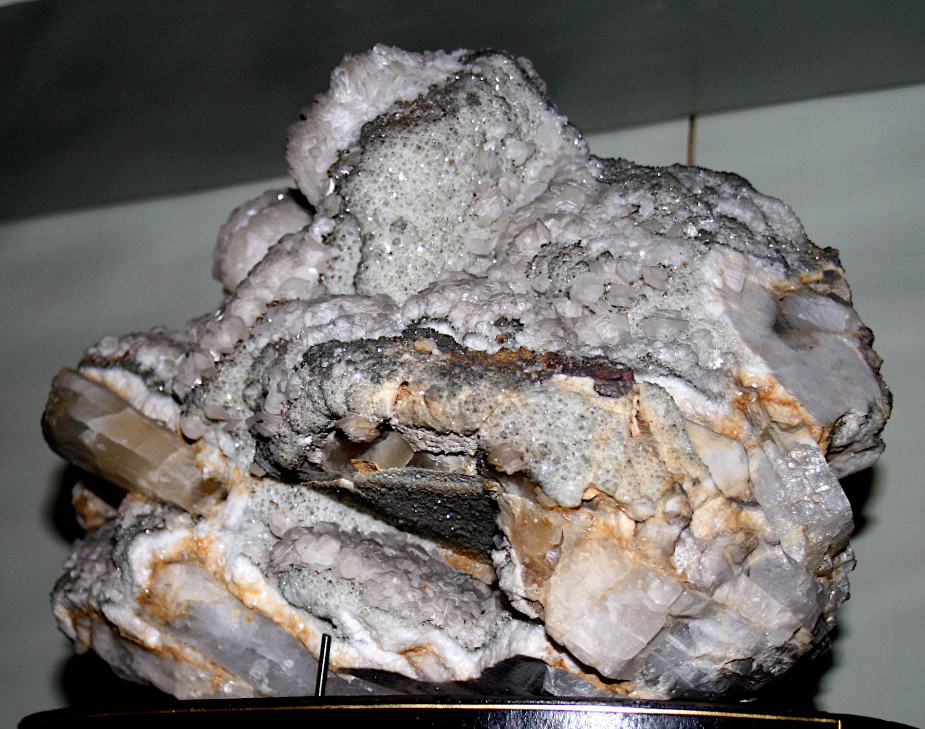 Baryt, auch Schwerspat genannt, is chemisch betrachtet Bariumsulfat Ba[SO4]. Mit einem spezifischen Gewicht von 4,5 g/cm³ ist es deutlich schwerer als normal Gestein, deshalb der Name. Baryt tritt normalerweise als derbe, weiße Ader im Gestein auf, vor allem in polymetallischen Lagerstätten ist es neben Flußspat in den Klüften zu finden. Es bildet sich also aus hydrothermalen Lösungen, aber auch sedimentär-exhalativ, insbesondere wo sich barium- und sulfatreiche Lösungen mischen. Baryte zeigen manchmal bei UV-Licht eine gelbliche, orange oder rosafarbene Fluoreszenz.