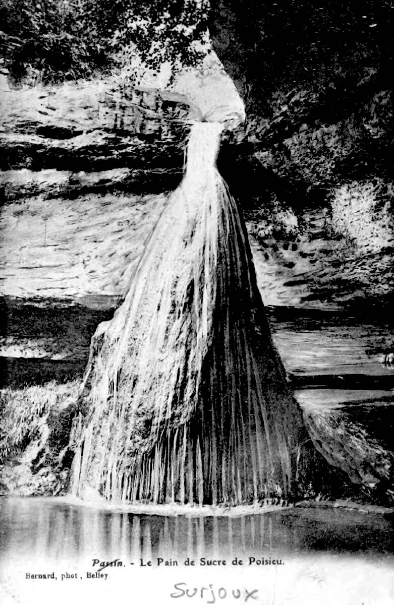 The Cascade du Pain de Sucre (Waterfall of the Sugarloaf) is a small waterfall of limestone rich water not far from the hamlet Poisieu, which belongs to Champagne-en-Valromey, formed by the river La Bèze. It is named after a strange rock formation where the water hits the ground, a subaerial 6 m high stalagmite formed of travertine. Its form resembles obviously a sugar loaf, hence the name.