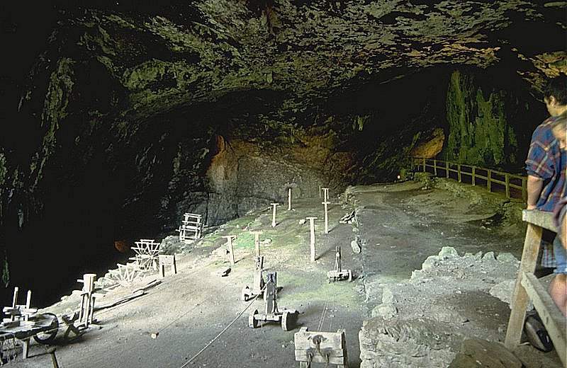 Right behind the entrance chamber the cave became not only small, but very low, and it was the bed of the cave river. There was only one way to cross this section, by lying down on a boat. It was widened using explosive, actually the only part of the tour were such massive alterations were necessary at all Today it is called Lumbago Walk, because traversing it still requires most adults to stoop. The tour follows the main passage through two main caverns, The Great Cave and Roger Rain’s House, and into a passage named Pluto’s Dining Room. Here is the end of the tour and the visitors return on the same path. Until 1990 the tour was twice as long, but at this point the trail descends on Devil’s Staircase to Halfway House, where the cave river, called Inner Styx, is met again. Unfortunately this part was flooded frequently in winter, and occasionally in summer. The required regular clearing of debris and mending of the trails and railings was quite expensive, and due to the floods the show cave was closed during winter. The last drop was the radon hysteria of the time, which had a rather high concentration in this lower part. Radon is a harmless noble gas, but it contains radioactive isotopes, and there was the fear, that cave guides which were exposed several hours daily, could get cancer. Actually most underground sites have radon and radiation sensors today, and the time underground is restricted, but it is definitely far less dangerous than they thought back then. Nevertheless, the far end of the tour was closed and since 1997 cave tours are offered all year round. The abandoned part of the cave tour was returned to a more natural state by removing the installation, especially the wooden bridges across the cave river.