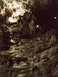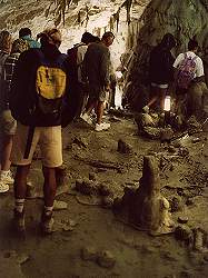 But now for the cave itself. It starts with a huge entrance hall, a portal right in the middle of a cliff face. Known for a long time, difficult to access, it impressed visitors for centuries. Here the visitors wait for the guide enjoying the breathtaking view or just resting from the strenuous ascent. Numerous balconies with some explanatory signs about the National Park and its nature (only in Italian unfortunately) lead up to the highest point of the cave. The portal has a shape resembling the profile of a horse, hence the name Grotta del Cavallone (Horse Cave). However, others say it’s the view from the cable car, the entrance to the cave marks the horse’s eye and the rock face has a shape which resembles its muzzle. From the highest point of the entrance hall, the tour starts. The cave narrows as soon as weathering from outside has no more influence, but the passage is still impressive, being 10 to 20 m wide and nearly the same height all the time. The visitors are equipped with helmets, which is obviously nonsense due to the high ceiling, but it seems to be part of the experience. There are numerous speleothems, but most of them are on the floor, stalagmites, flowstone and rimstone pools. The speleothems on walls and ceiling are rather small and sparse. The main passage goes up and down all the time, there are several pits, one is even a sort of shaft which must be crossed. On our visit [2001] the path went down into all those pits and back up on the other side, but the bridges which cross the pits where already half assembled. As there is no second exit, the tour has to go back the same way and cross all those pits a second time.