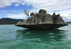 Rodrigues Island is a volcanic island 18 km long and 8 km wide. While it is basaltic at its core, the south-western part of Rodrigues and its fringe on other sides are covered by a thick layer of calcarenites. The island is surrounded by coral reefs, which form a limestone belt around the island. On the western side the reef has moved away from the coast over several thousand years of growth, to result in the current barrier reef. Huge areas of the reef fall dry during low tide, and during the last glaciation the reef was completely dry. Limestone sand resulting from the marine erosion of the coral reef or from foraminifera was blown to the island and accumulated in dunes. This limestone sand grains were solidified by carbonic acid in the rainwater, which dissolved and precipitated limestone creating the coarse-grained sandstone called calcarenites. The rock is also called an aeolianite, which more or less means a rock formed by wind, and is a more general term. The limestone is used for various purposes like building houses, it is soft enough, that men can cut big pillars using saws.